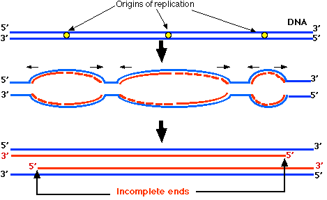 This continues until close to the end of the chromosome. However, the molecular requirements of the process are such that 5' end of each newly-synthesized strand cannot be completed. Thus each of the daughter chromosomes will have a shortened telomere.