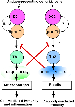 - Interleukin 10 (IL-10). Inhibits pre-Th cells from entering the Th1 pathway (shown in red).