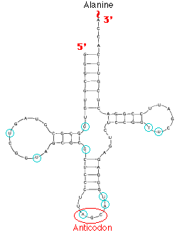 This image shows the structure of alanine transfer RNA (tRNAala) from yeast. It consists of a single strand of 77 ribonucleotides. The chain is folded on itself, and many of the bases pair with each other forming four helical regions. Loops are formed in the unpaired regions of the chain. (The bases circled in blue have been chemically-modified following synthesis of the molecule.)