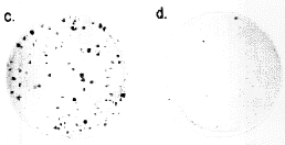 This image (courtesy of Moshe Oren, from Cell 62:671, 1990) shows petri dishes which were seeded with the same number of cells that had been transformed by two oncogenes: myc and ras. Many of those on the left have grown into colonies of cells. However, the cells plated on the right also contained the tumor suppressor p53 gene. Only a few have been able to grow into colonies.