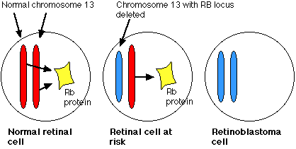 Familial retinoblastoma occurs when the fetus inherits from one of its parents a chromosome (number 13) that has its RB locus deleted (or mutated). Then random mutation of the remaining RB locus in any retinal cell removes the inhibition provided by the Rb protein and the affected cell grows into a tumor. So, in this form of the disease, a germline mutation plus a somatic mutation of the second allele leads to the disease.
